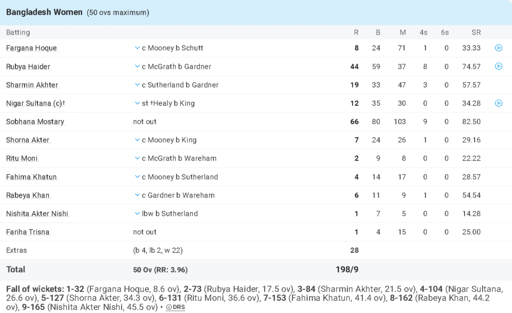However, once Australia’s attack pinched breakthroughs, the pressure told. They lost wickets at regular intervals, and although Mostary hung in, the supporting cast couldn’t build the momentum. Extras and fielding lapses also crept in, increasing the required effort for the bowlers — and Alyssa Healy & Co. were more than ready.