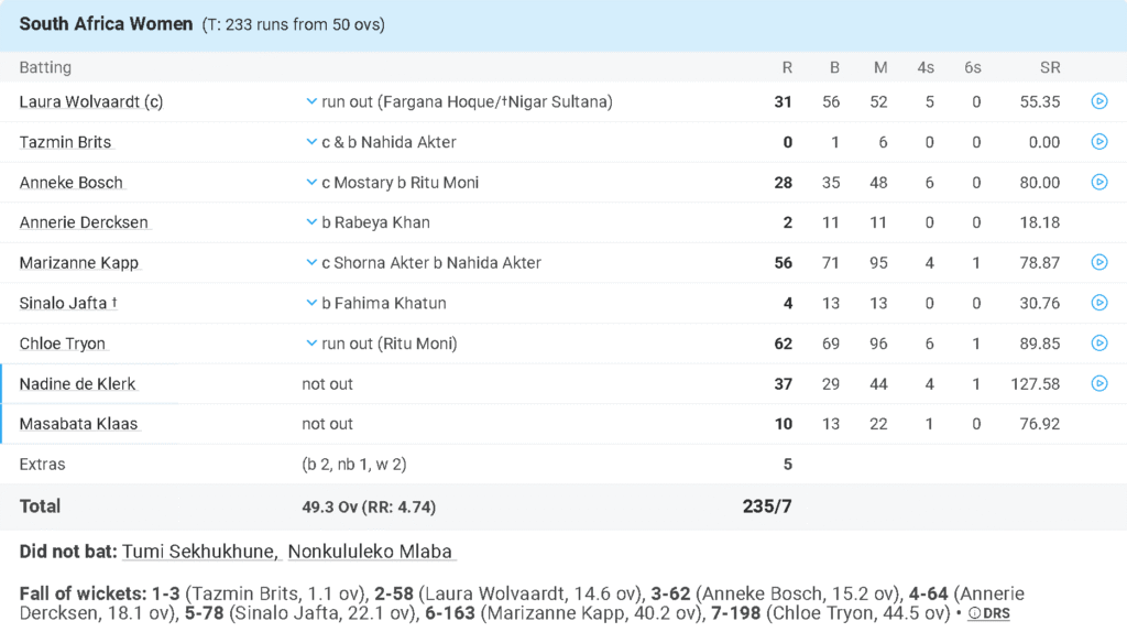 Her dismissal in the penultimate over briefly reignited Bangladesh’s hopes, but by then, the damage had been done. The Proteas held their nerve, crossing the finish line with three balls to spare, ending at 235/7 in 49.3 overs.