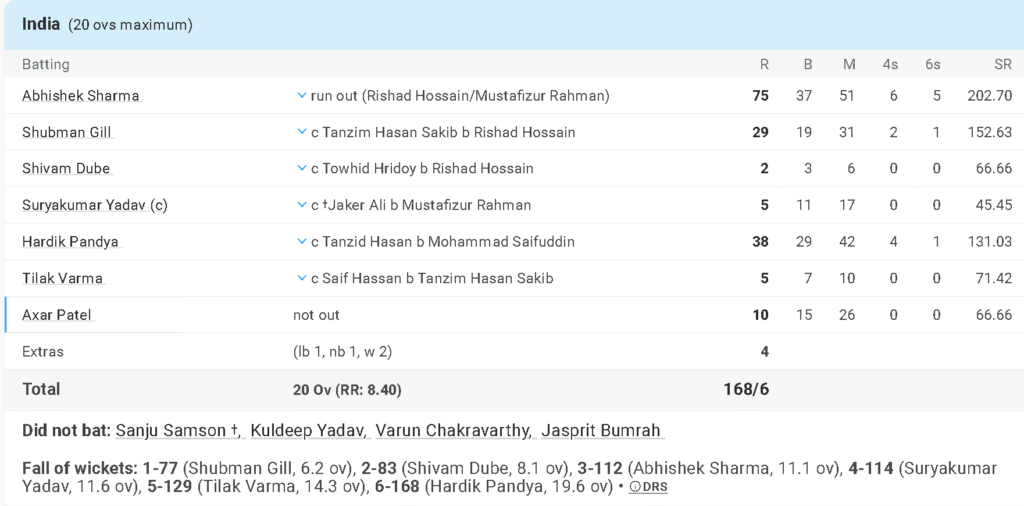 Though India’s middle order wavered after Sharma’s dismissal, Hardik Pandya added a crucial 38 off 28 balls to carry the side to 168/6 in 20 overs. Bangladesh’s bowlers, led by Shakib Al Hasan and Mustafizur Rahman, tried to claw back control, but the damage from Sharma’s assault was too great to contain.