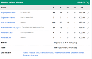 Nat Sciver- Brunt finished unbeaten on 100 from 57 balls, striking 16 fours and one six. Her innings powered the Mumbai Indians to a strong total of 199 for four. Speaking at the break, Nat Sciver-Brunt admitted she was aware of the so-called 90s curse and was determined not to fall into it. She said her main focus was to score as many runs as possible for the team.